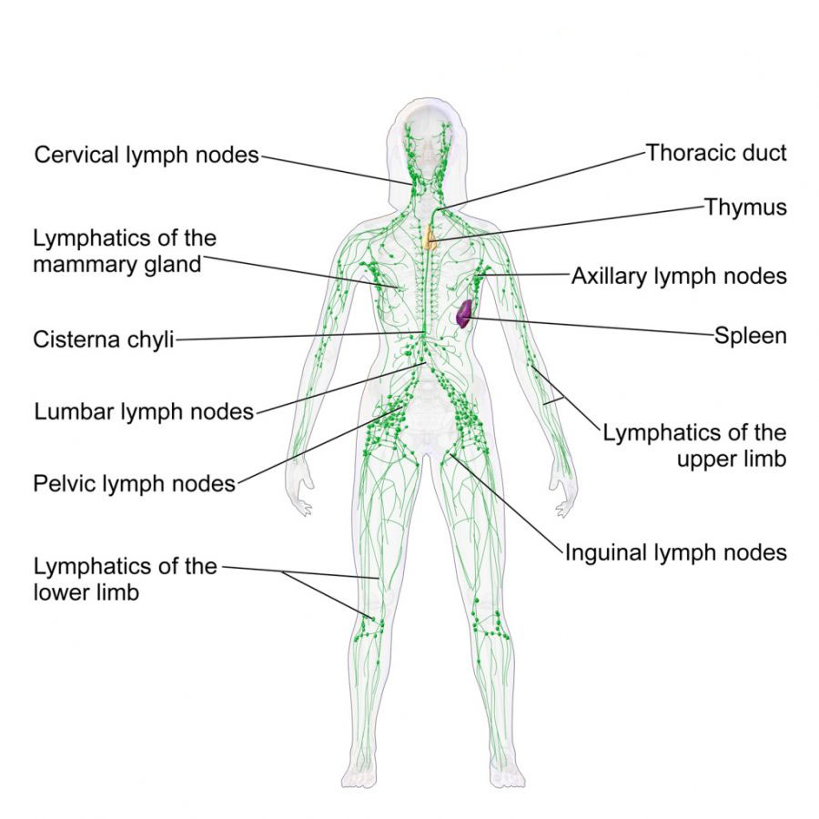 In den Verlauf der Lymphbahnen sind vor allem am Hals, in den Achselhöhlen, im Bauch, in den Leisten und in den Kniekehlen Lymphknoten zwischengeschaltet. Sie spielen eine enorm wichtige Rolle im Immunsystem: Infektionserreger oder auch Krebszellen gelangen via Lymphgefässe zu den Lymphknoten und werden dort herausgefiltert. Es werden spezifische Abwehrzellen (Lymphozyten) gebildet, welche mit der «gesäuberten» Lymphe ins Blut gelangen und gegen Erreger oder Krebszellen ankämpfen.